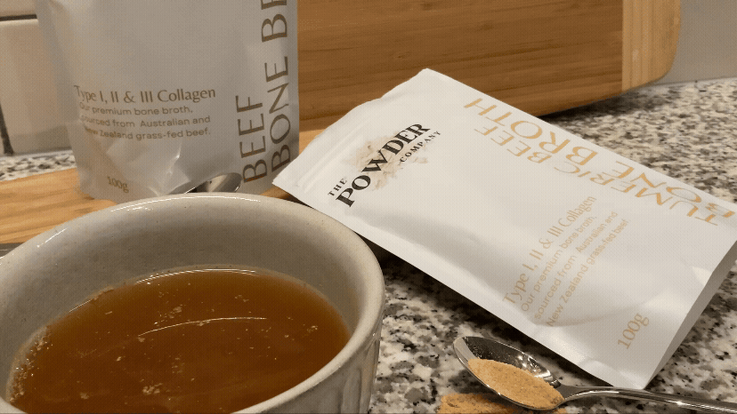 Collagen is an isolated supplement. Bone broth powder includes collagen plus gelatin, amino acids and minerals from bones and marrow – more complete nutrition.